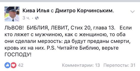 Напомним, глава департамента противодействия наркопреступности Нацполиции Илья Кива решил высказаться по поводу срыва Фестиваля Равенства во Лвове. «ЛЬВОВ! БИБЛИЯ, ЛЕВИТ, Стих 20, глава 13. Если кто ляжет с мужчиною, как с женщиною, то оба они сделали мерзость: да будут преданы смерти, кровь их на них.