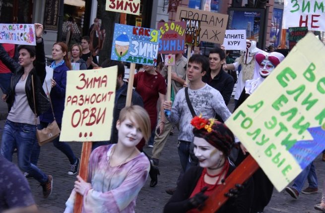 In these days art activism is often used as a form of protest. For example, last October monstration took place in Odesa – nonpolitical demonstration with the mottos that seemed absurd at first glance ("How can I explain winter to my children?", "Winter dictatorship won't work", "Allow winter to come once and it will stay for the whole year"). Activists were out protesting against totally natural phenomenon of winter in a similar way others often protest "against sexual orientation."
