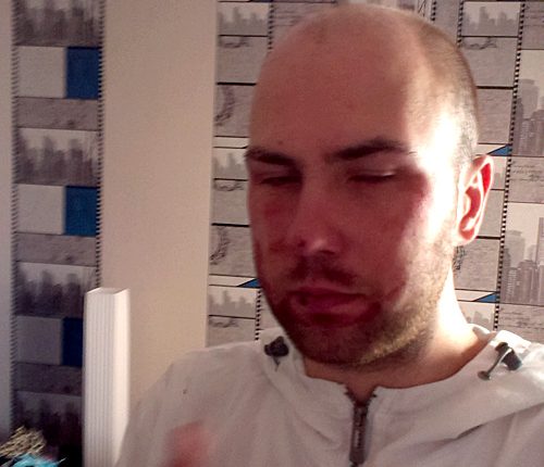 Three unknown persons, dressed in camouflage, waited for him near his house under the porch. The attack resulted in a split lip and a large hematoma under his left eye. Konstantyn was repeatedly beaten by the criminals on his kidneys; one of the strikes hit his nose.