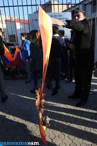 On November 6 a protest against LBGT took place in front of the EU office in Yerevan, where Agaronyan burned the rainbow flag as a sign of protest.