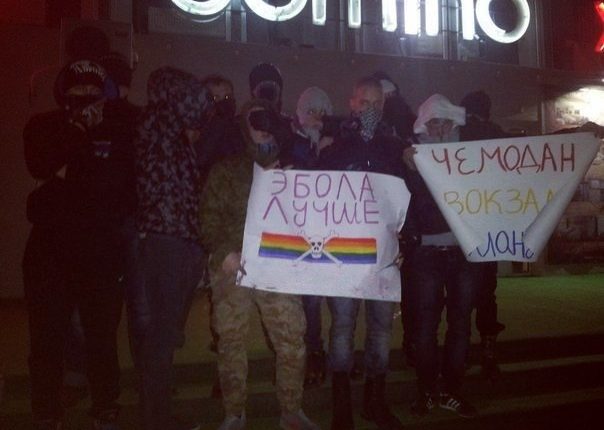 Around 2 am young men in camouflage with bandages on their faces surrounded the facility shouting homophobic slogans and trying to get into the club. Young men held posters in their hands with slogans "Ebola is better than queers", "Suitcase. Railway station. Holland" and were extremely aggressive. According to eyewitnesses, the attackers brought along bats, brass knuckles and edged weapons. At the same time police officers located nearby (by agreement between the organizers of the competition and the city authorities, law enforcement were involved to during a party to ensure security) were completely inactive.