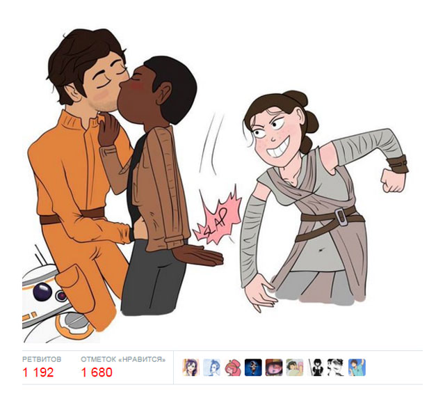 Напомним, что после выхода в прокат фильма «Звездные войны: Пробуждение силы» многие поклонники франшизы пришли к выводу о том, что два героя этой ленты, По Дэмерон и Финн, могут быть романтически связаны. Подозрения только укрепились после того, как Райан Джонсон, который был назначен режиссером следующего фильма эпопеи, опубликовал у себя в Твиттере шарж, на котором эти два персонажа обмениваются страстным поцелуем.