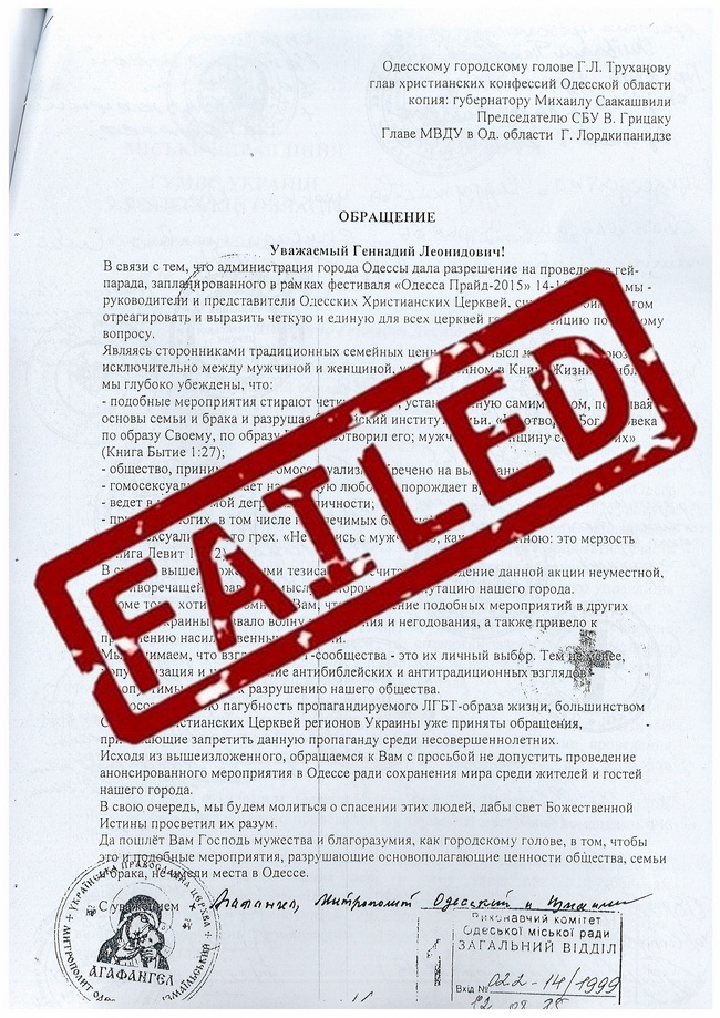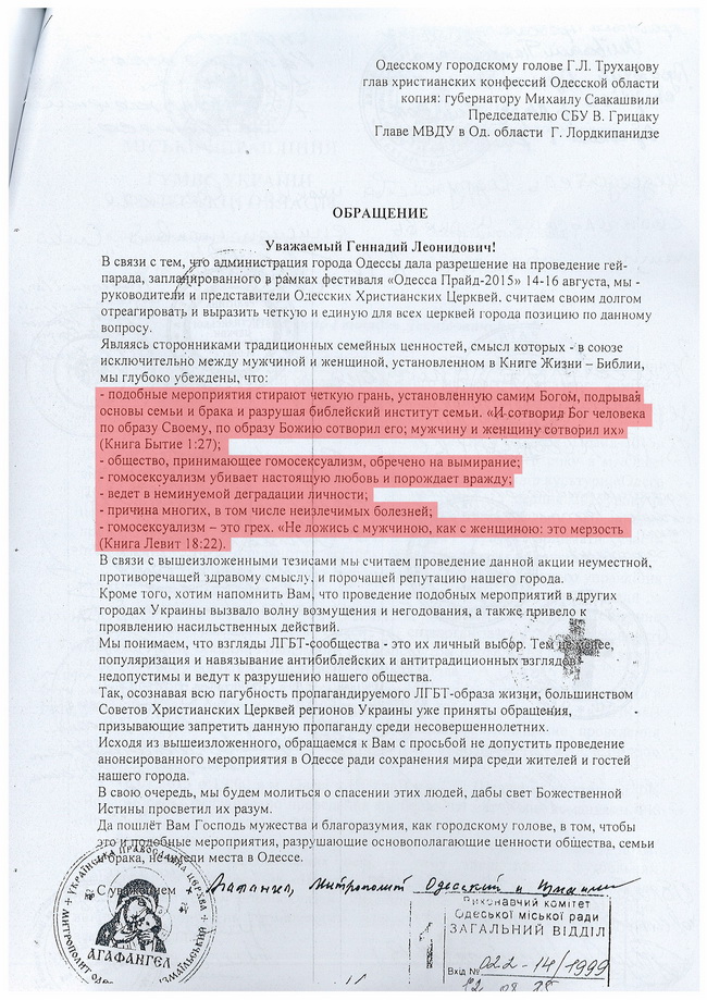 Как мы уже писали, накануне открытия ОдессаПрайда 2015 главы христианских конфессий Одесской области направили обращение мэру Одессы Геннадию Труханову с требованием запретить проведение Марша Равенства. Главным их аргументом являлось то, что общество, принимающее «гомосексуализм», обречено на вымирание, «гомосексуализм» ведет к неминуемой деградации личности и является причиной многих, в том числе неизлечимых болезней. Утверждалось также, что подобные мероприятия подрывают основы семьи и брака, и вообще «гомосексуализм — это грех».