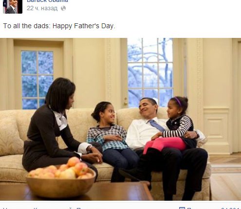 "Отцовство требует постоянного внимания, здоровой дозы терпения и зачастую — жертв. Даже в нынешние времена, когда технологии позволяют связаться фактически с любым человеком на земле, ничто не заменит отцовской заботы и поддержки. В День отца мы выражаем свою благодарность людям, которые показывают нам, как учиться, расти и жить", — говорится в обращении Обамы.