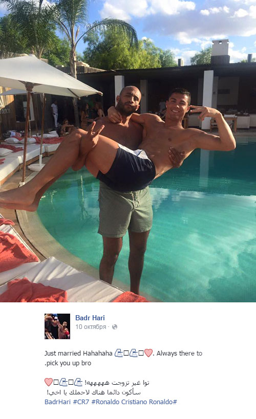 Пара неплохо отдохнула в африканской стране (где, к слову, действуют суровые антигейские законы), а Хари на прошлой неделе разместил в Фейсбуке фото с Роналдо на руках и подписью: «Just married» (дословно — «только что поженились/вышли замуж», стандартная для англоговорящих фраза, которой сопровождаются свадебные фото и которая размещается на автомобиле, везущем молодоженов с места регистрации брака).