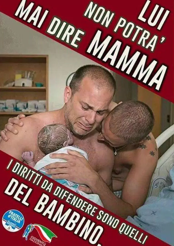 Фото используется правой партией «Братья Италии — Национальный альянс», в частности, ее молодежным крылом, для кампании, направленной против однополых семей и родительства. О соблюдении авторских прав речь, естественно, не идет: авторку снимка даже не поставили в известность, в противном случае она запретила бы использовать сделанное ею фото в подобных целях.