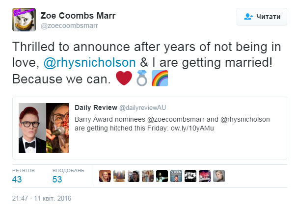 У себя в Твиттере она написала: «Я невероятно рада сообщить, что после долгих лет нелюбви с Райсом Николсоном мы, наконец-то, поженились! Потому что это мы можем».