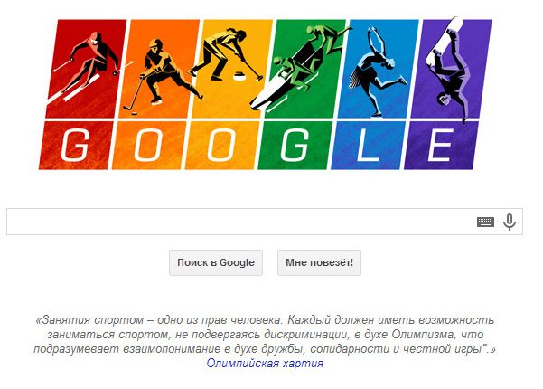Напомним, что в день открытия Олимпиады в России — стране, вопиющим образом нарушающей права человека в отношении ЛГБТ, — поисковая система Google "потроллила" российские власти и внесла изменения в свой логотип: вывесила на главной странице дудл, раскрасив его в шесть цветов радужного ЛГБТ-флага. Под дудлом содержалась надпись: "Занятия спортом – одно из прав человека. Каждый должен иметь возможность заниматься спортом, не подвергаясь дискриминации, в духе Олимпизма, что подразумевает взаимопонимание в духе дружбы, солидарности и честной игры". Олимпийская хартия".