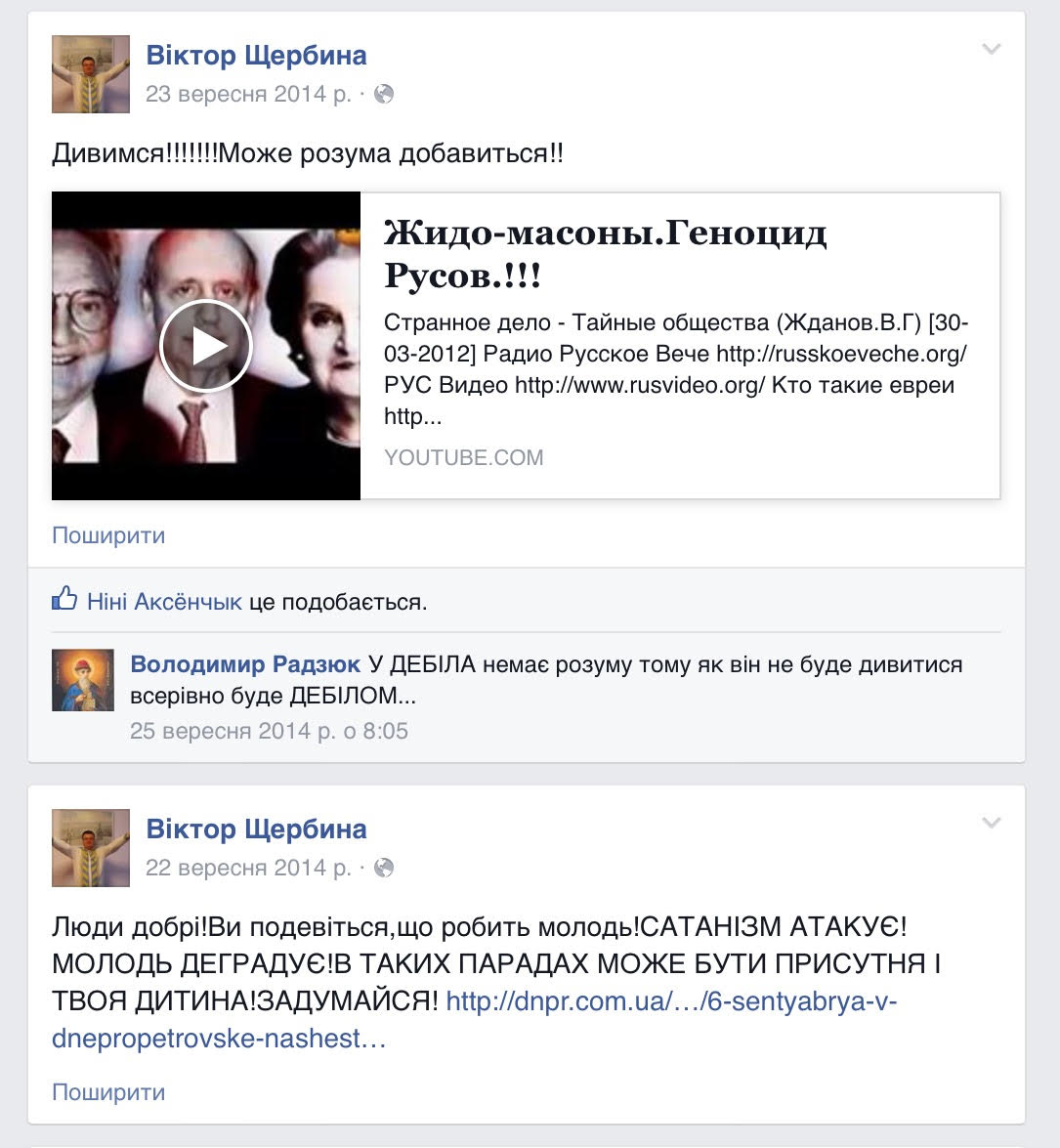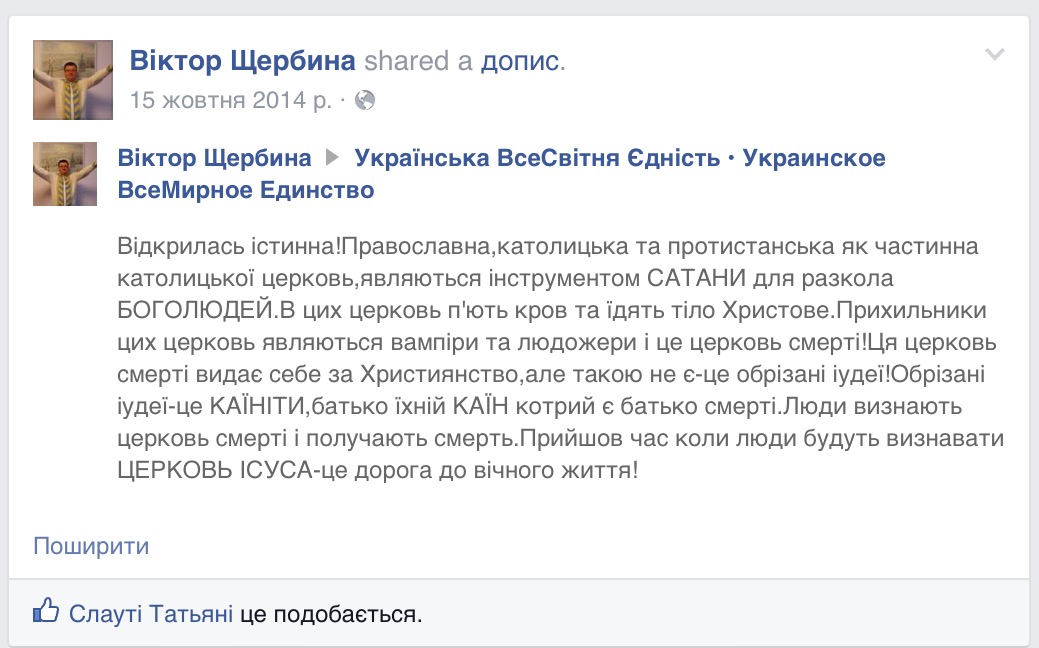 Мы попробовали разобраться, что это за человек и какие цели он преследует: чем же ему так не угодили геи, и что он подразумевает под сатанизмом. Итак, знакомьтесь: Щербина Виктор, 1976 года рождения, и вот что он пишет на своей странице в фейсбуке:
